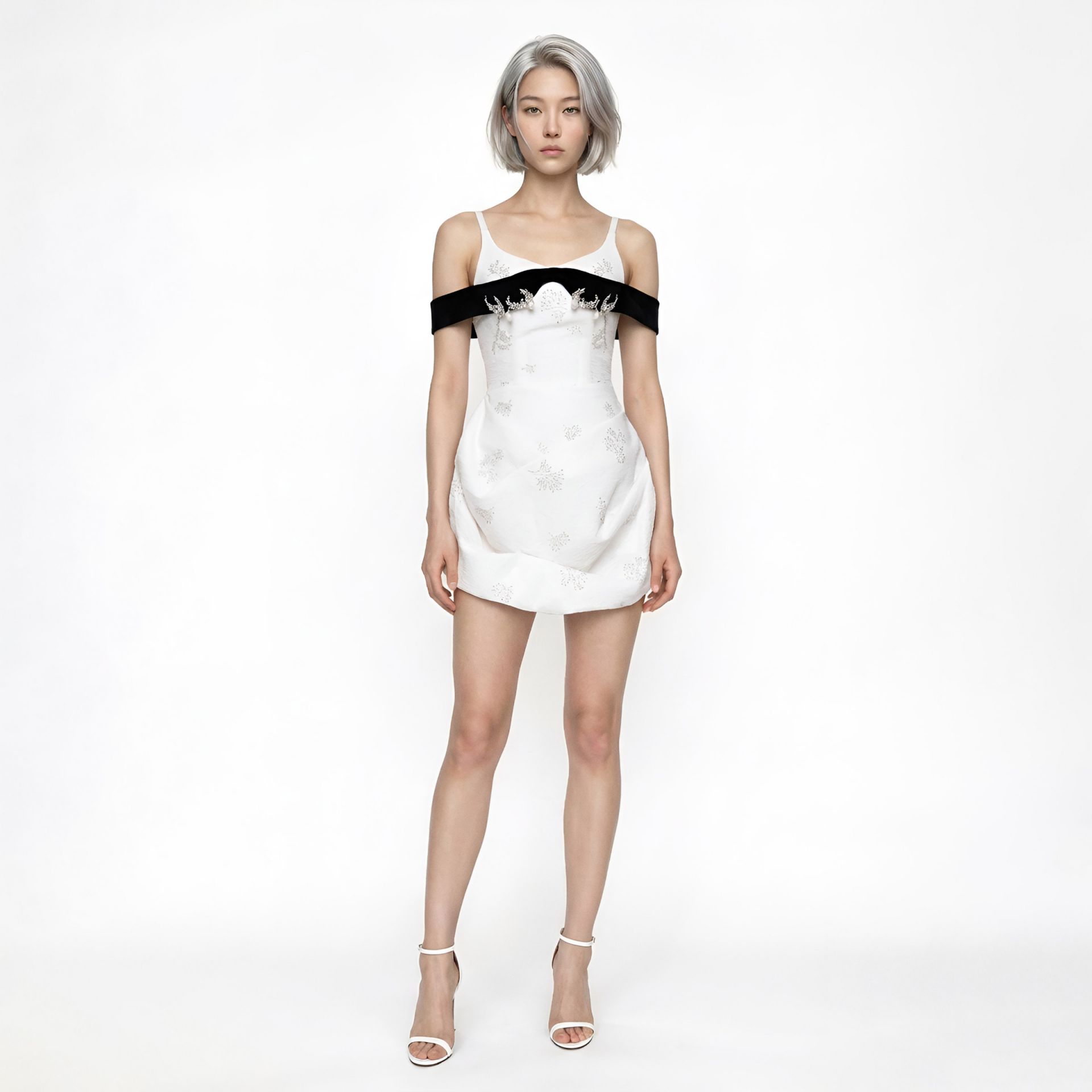 1. Энэхүү цагаан коктейл даашинз нь модерн загвар болон гар хийцлэл бүхий чимэглэлийг хослуулсан онцгой загвар юм. Их бие дагуу байрлах сувдан шигтгээтэй цэцэгэн чимэглэл нь гэрэлд гялалзаж, luxe мэдрэмж түрүүлнэ.